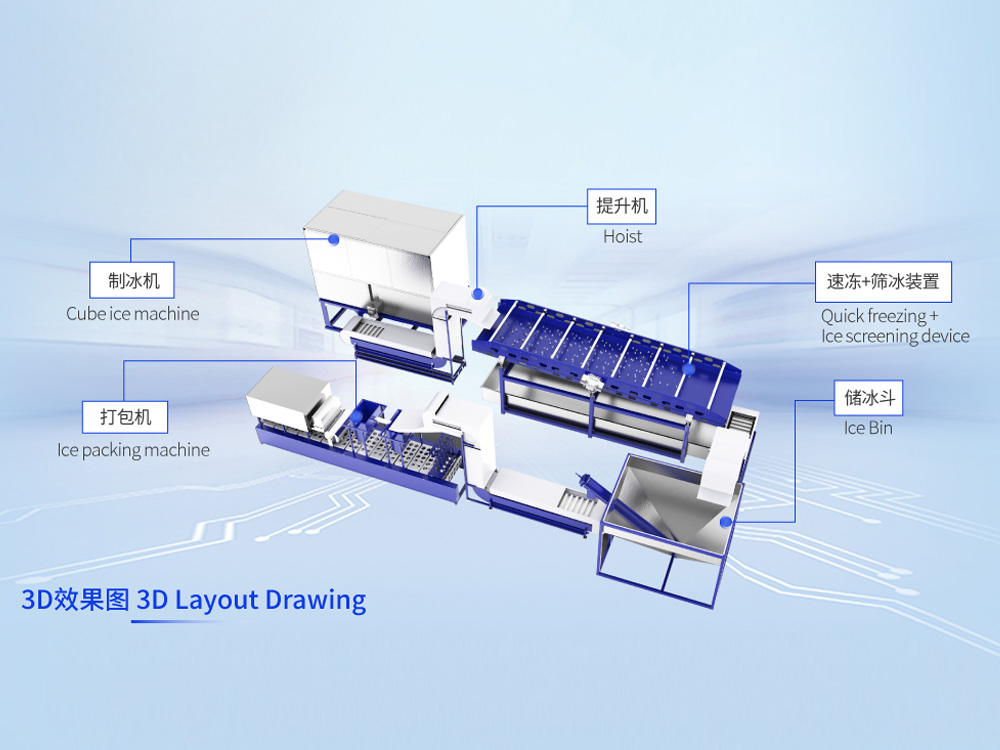 全自動(dòng)化食用冰生產(chǎn)線是一套高度集成的無人化、自動(dòng)化創(chuàng)新設(shè)備,專為大規(guī)模生產(chǎn)、衛(wèi)生健康、高質(zhì)量的食用方冰廠而設(shè)計(jì)。該系統(tǒng)不僅包括了制冰機(jī),更集成有凈水器,儲(chǔ)冰斗、速凍振動(dòng)篩、傳輸系統(tǒng)、提升機(jī)以及自動(dòng)稱重、打包機(jī),形成了一條從制冰到包裝的全自動(dòng)化生產(chǎn)線。