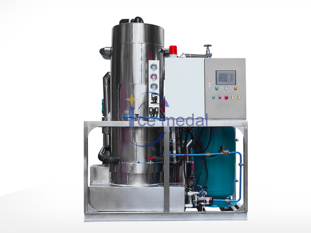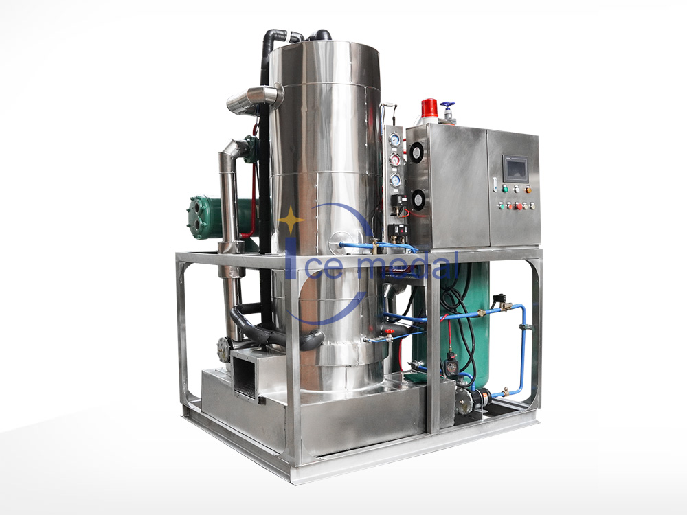 2、管冰機(jī)所有與制冰水接觸部分材質(zhì)均是食用級材料。 由多根不銹鋼管組成蒸發(fā)器制冷劑在管與管之間流動,水在管內(nèi)從上往下在分水器的作用下呈螺旋狀流動, 水在流動過程中形成冰。