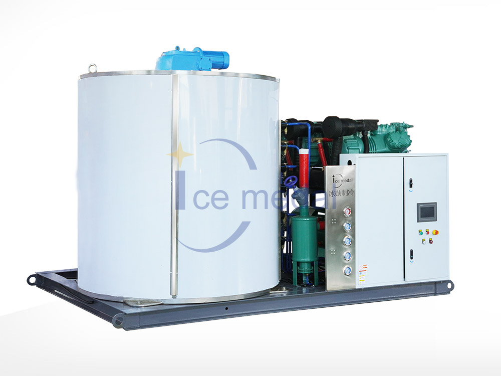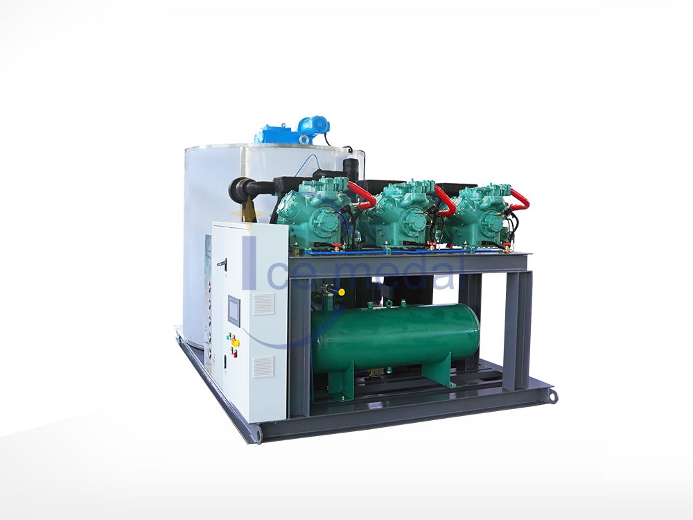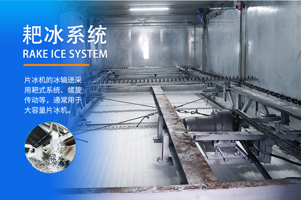 30噸24小時(shí)片冰機(jī)廣泛應(yīng)用于海港魚類冷卻、混凝土加冰降溫等。片冰機(jī)采用立式螺旋切冰蒸發(fā)器。制冰時(shí)水要均勻,通過分水裝置分布到冰桶內(nèi)壁。該系統(tǒng)由集裝箱式片冰機(jī)、帶耙系統(tǒng)的冷庫組成。